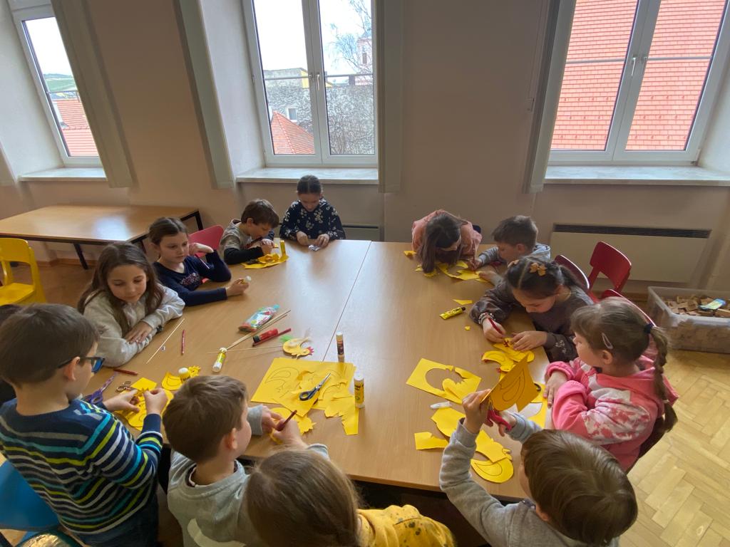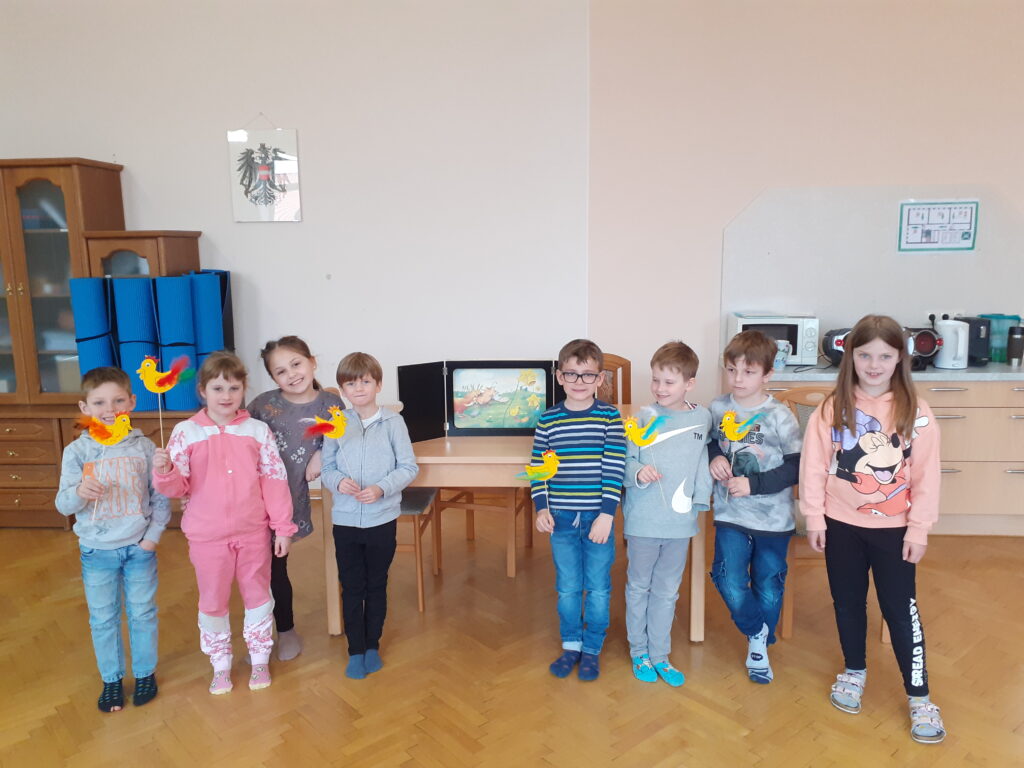 Gemeinsam wurde gesungen, getanzt, gelesen und gebastelt. Unsere Schülerinnen lasen den Kindergartenkindern die Geschichte „Das Osterküken“ vor, in der ein Küken unbedingt am Ostersonntag schlüpfen möchte und daher herausfinden muss, wann genau Ostern ist.