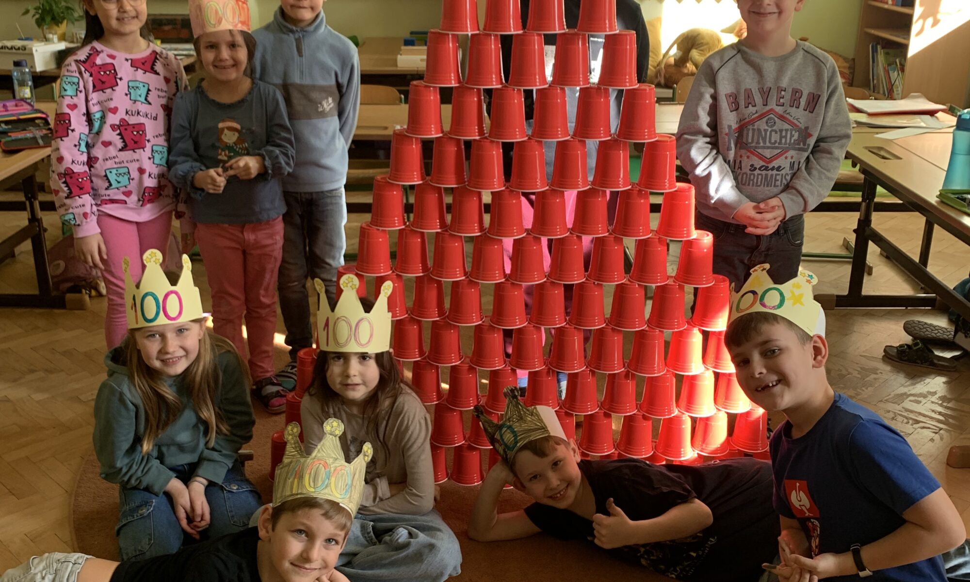 Die erste Klasse hat am 26.2 den 100. Schultag gefeiert. Seit Schulbeginn haben wir die Tage gezählt. Um die Zahl 100 zu begreifen, haben wir 100 Fingerabdrücke gestempelt, 100 Becher gestapelt, usw. Außerdem haben wir eine „100 Tage Schulkindkrone“ gebastelt. Wir freuen uns auf weitere gemeinsame Schultage.