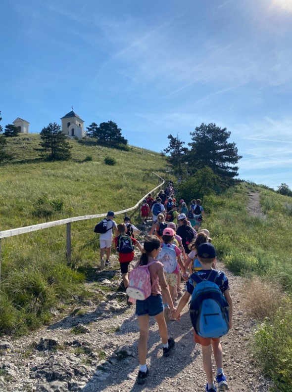 Bei schönem Wetter wanderten wir am 19.06. den Heiligen Berg/ Svatý kopeček in Mikulov hinauf. Am Gipfel des Berges genossen wir den atemberaubenden Ausblick auf das Schloss und die Stadt. Nach einer kurzen Pause marschierten wir durch die Stadt, bis wir beim Schlosskeller ankamen. Dort führte uns unsere Tschechischlehrerin Mag. Katerina Austova durch den Schlosskeller und erzählte die interessante Geschichte rund um das große Fass im Inneren des Kellers. Am Ende des Ausfluges ließen sich die Kinder am Hauptplatz ein köstliches Eis schmecken. Während des gesamten Ausfluges konnten sie viel Wissenswertes über die nahegelegene Grenzstadt Mikulov erfahren.